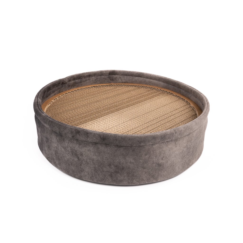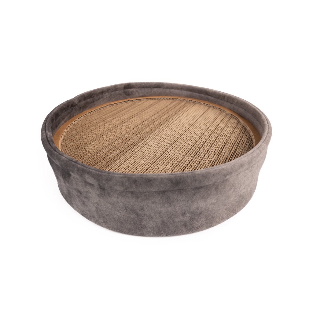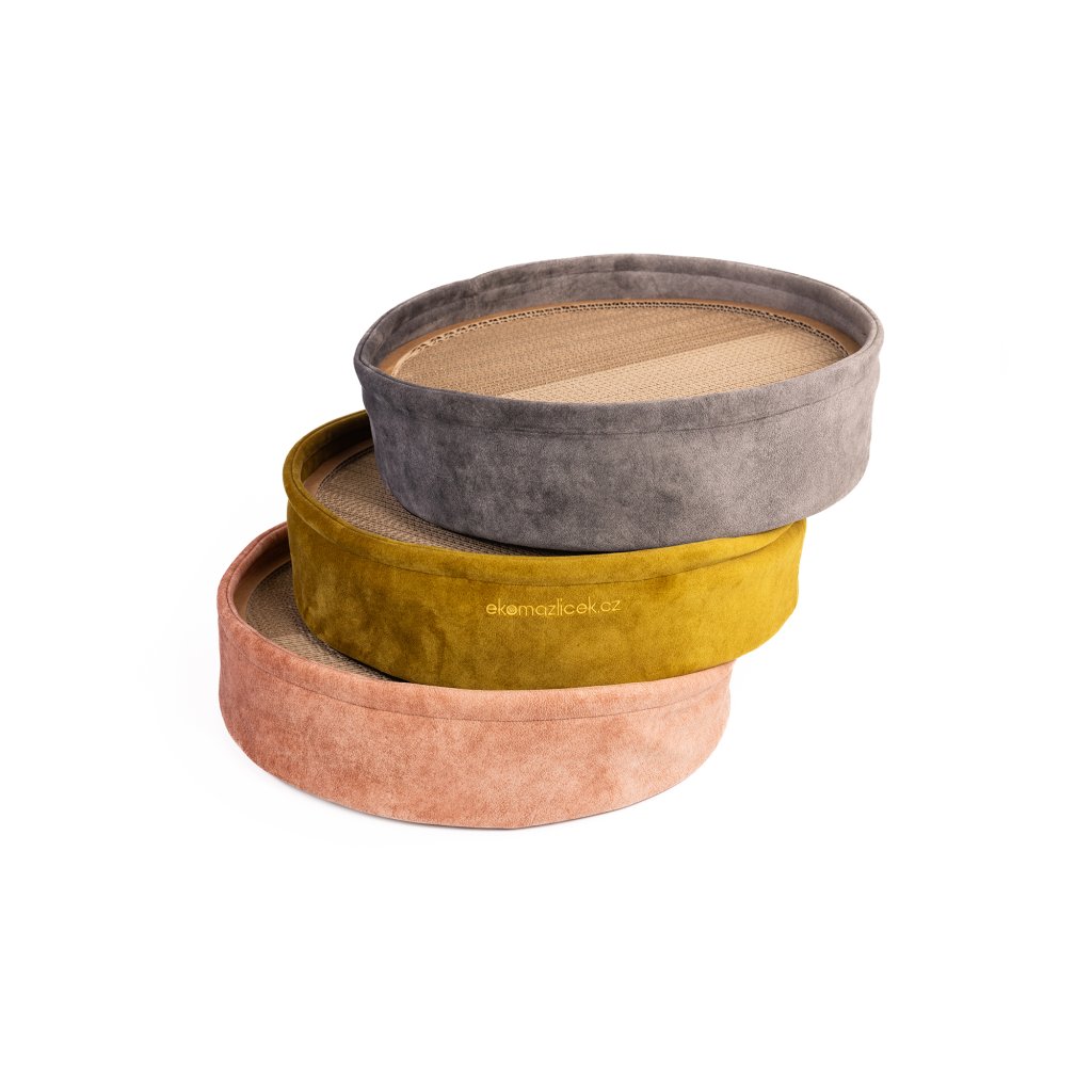 Stylový škrabolíšek z našeho tvrzeného kartonu s hebkým okrajem – ideální pro mlsné drápky i pohodlný odpočinek. Vyrobeno námi v Česku, průměr 40 cm. Po opotřebení vnitřku stačí vyměnit jen karton.