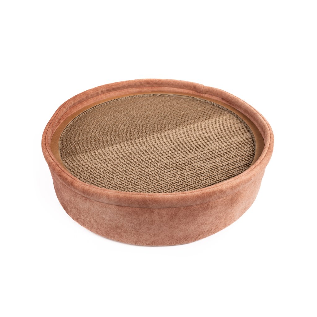 Stylový škrabolíšek z našeho tvrzeného kartonu s hebkým okrajem – ideální pro mlsné drápky i pohodlný odpočinek. Vyrobeno námi v Česku, průměr 40 cm. Po opotřebení vnitřku stačí vyměnit jen karton.